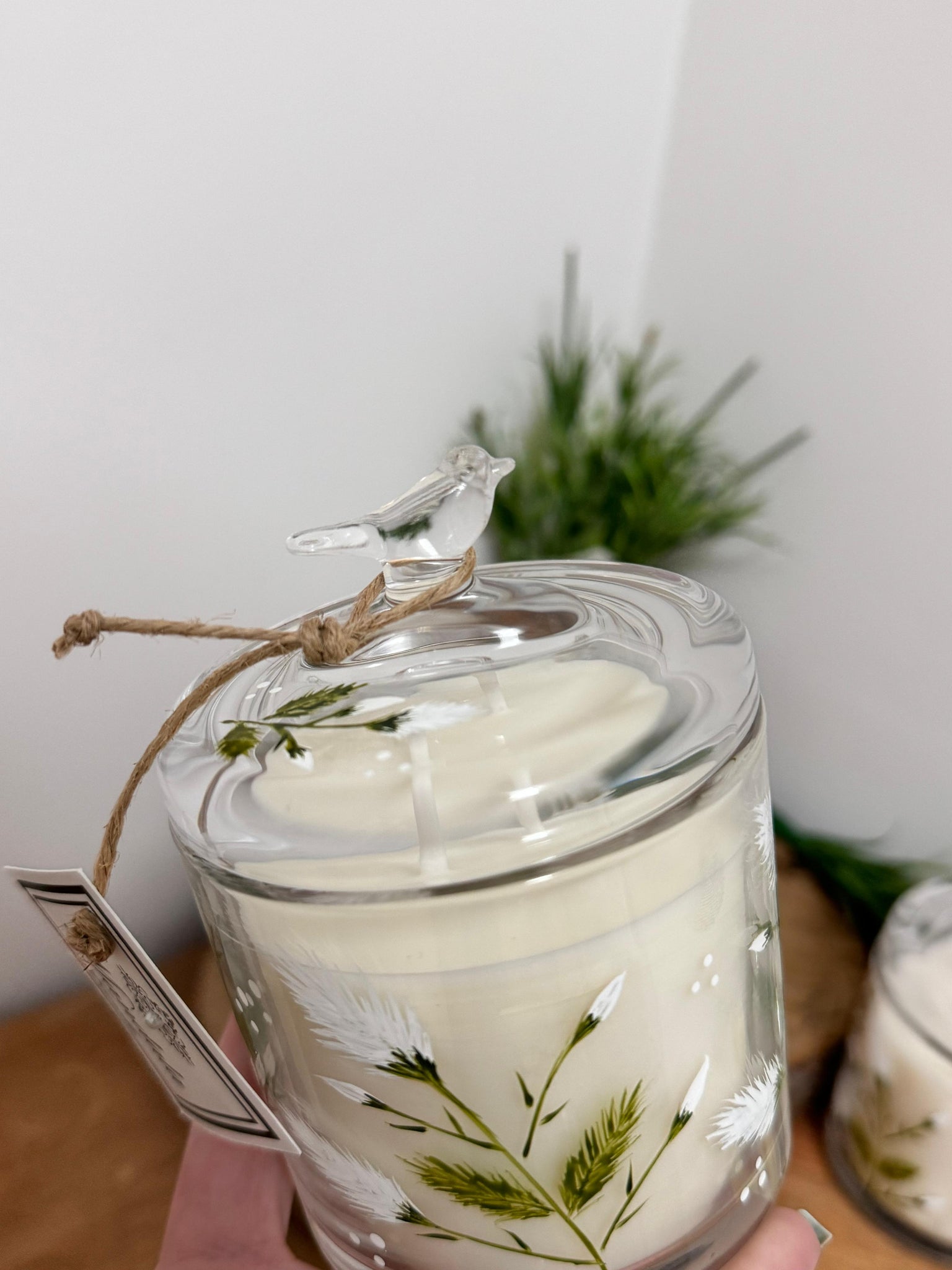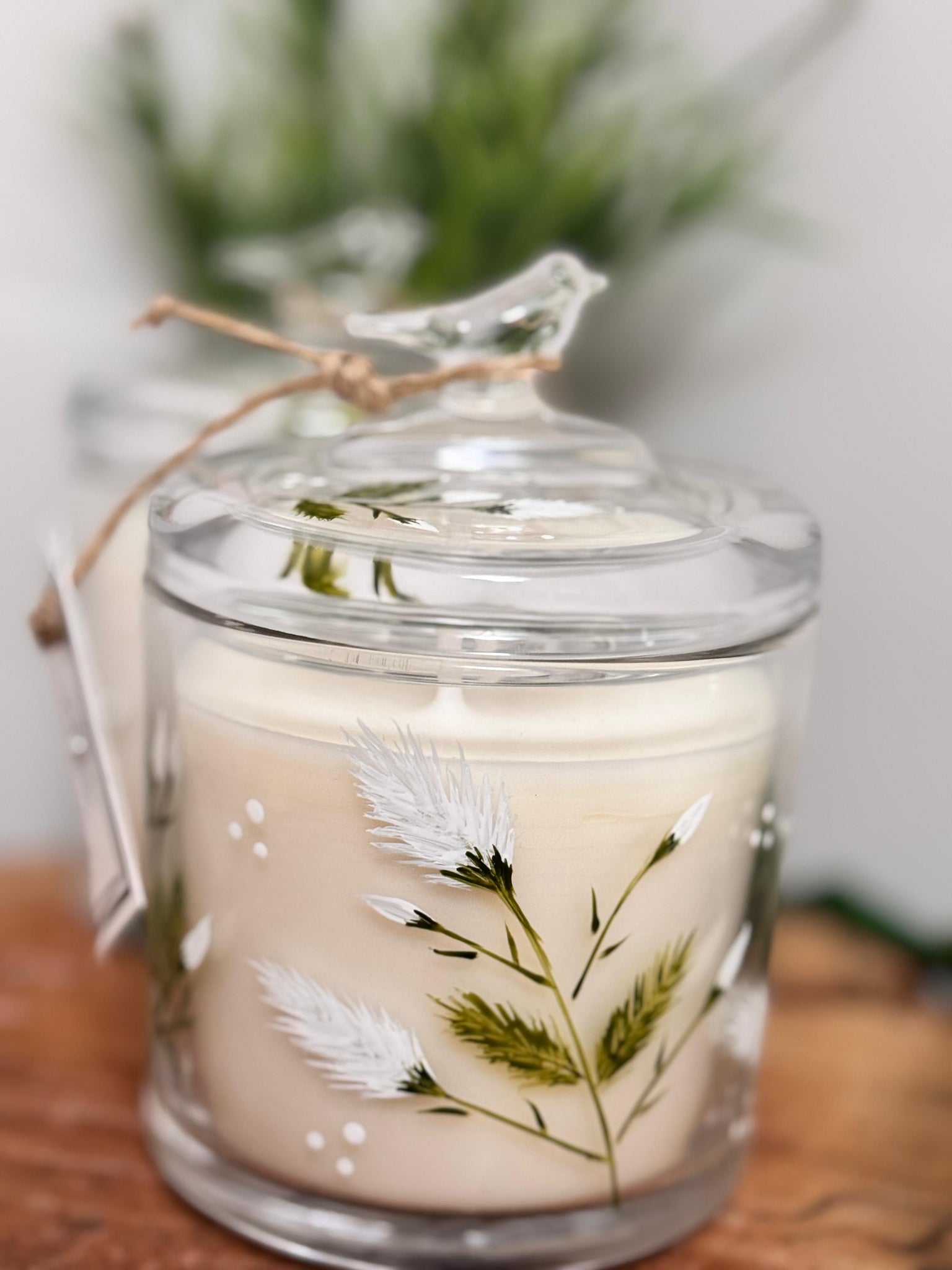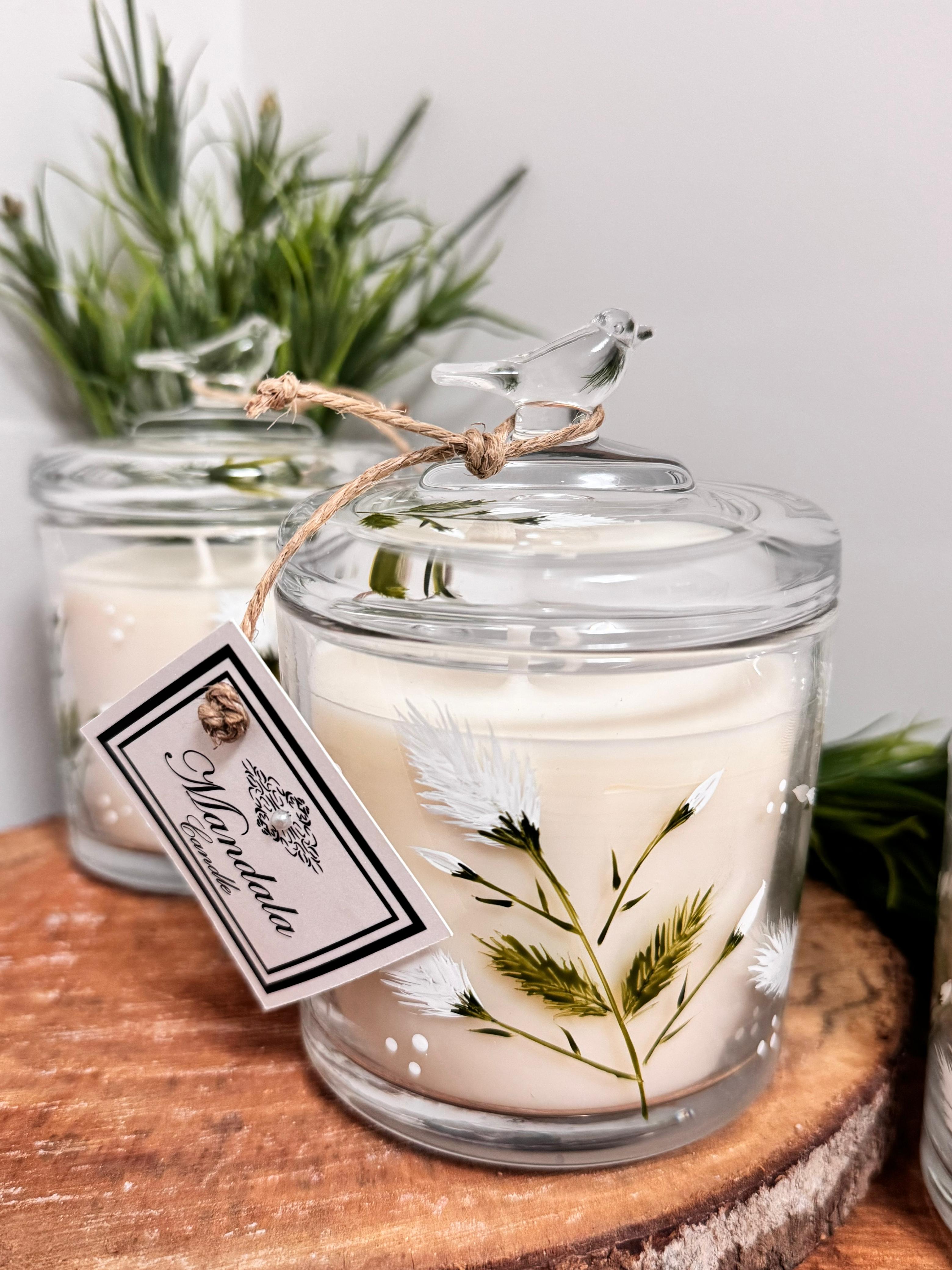 Vela com vidro, tampa com pássaro, pintada a mão.